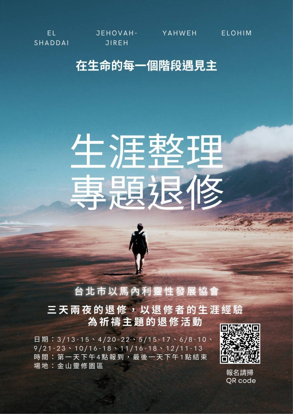生涯整理專題退修:三天兩夜的退修,是以退修者的生涯經驗為祈禱主題的退修活動。日期:3/13-15、4/20-22、5/15-17、6/8-10、9/21-23、10/16-18、11/16-18、12/11-13時間:第一天下午4點報到,最後一天下午1點結束場地:金山靈修園區報名請填寫以下的連結或掃描QRCODE